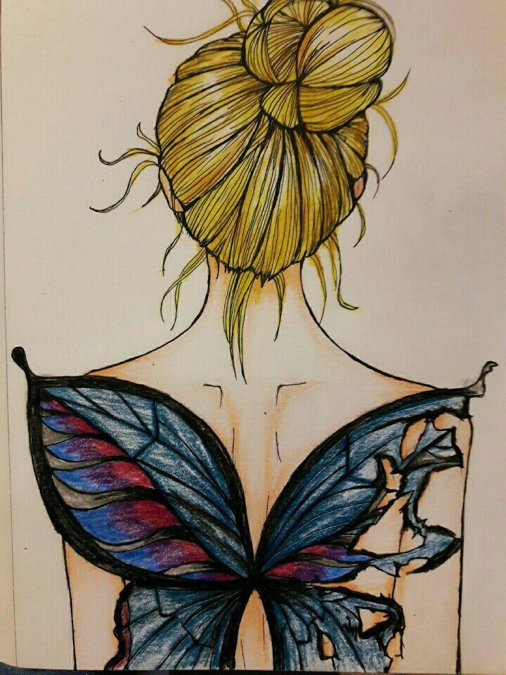 나비여자 라는 제목을 써봅니다 오글오글. 한쪽 날개는 찢겨져있죠? 나름의 상처를 표현한 모습을 그려봤어요.