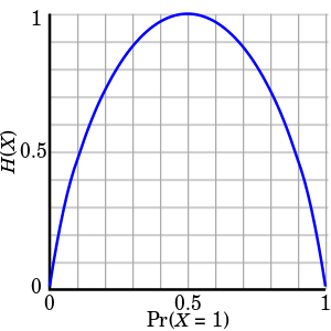 동전 하나를 던지는 경우를 예를 들면(동전을 던져서 결과는 항상 앞, 혹은 뒤만 나온다고 가정), 앞 뒷면이 나올 확률이 각 50%, 50%인 매우 공평한(fair) 동전일 수도 있고, 앞 면의 확률이 더 높을 수도 있다. 이 확률 값에 따른 엔트로피 계산 결과는 아래 그래프를 따른다.