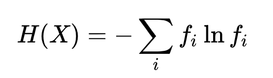 위 식에서 fi는 i사건이 일어날 확률이며, ln은 log함수를 의미한다. i사건이 이항푼포(binomial distribution)를 따를 때, 즉 0과 1 혹은 기다 아니다로 결정지어질 수 있는 경우 log2 된다.