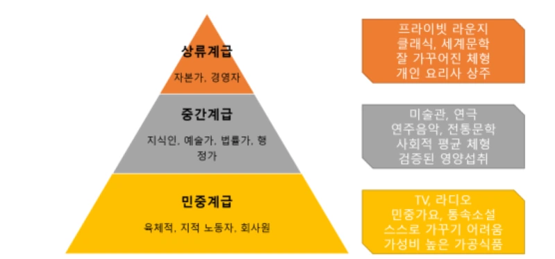 부르디외의 연구를 보면 이처럼 유사한 취향을 공유한 집단이 동일한 '계급'을 형성하는 것을 볼 수 있다. 계급 차이는 곧 취향의 차이로 이어지고, 이는 곧 생활 방식의 차이로 나타난다.