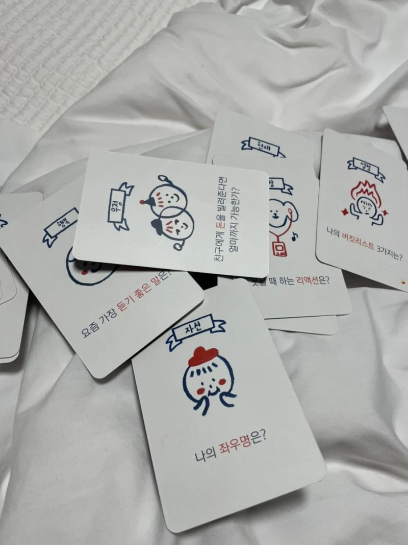 언니가 가져온 질문 카드. 처음에 언니가 질문 카드를 가지고 다닌다고 했을 때 어쩜 이런 사람이 있지? 정말 대화에 진심인 사람이구나! 생각하고 신기해 했는데 나도 구매하고 싶어졌다. 은근 재밌고 쓸모있는 주제들이 많아서 친구들이랑 놀 때 마다 항상 들고 다녀야 겠다를 생각하게 될 정도다.