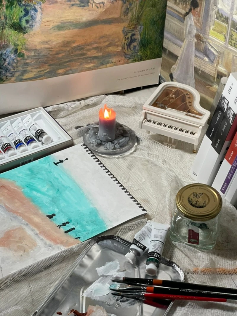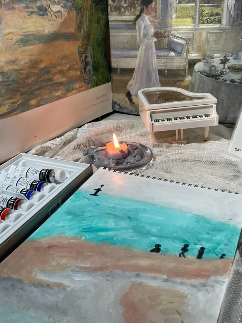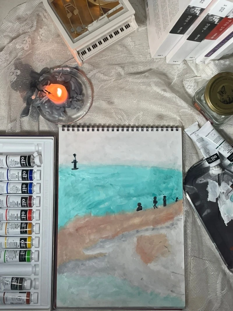 . 집으로 돌아온 뒤, 문득 그림이 그리고 싶어져서 물감과 스케치북을 꺼냈다. 오늘 본 바다를 그리고 싶었다. 유화를 그리는 일은 날 편안하게 만든다. 원하는 대로 색을 섞어 만들고, 이리 저리 진하기도 하다가 옅게도 칠해지는, 그리고 붓의 흔적이 남는 유화가 참 좋다. 그냥 오늘 느낀 감정을 시각적으로 표현하고 싶었다. 라나 델 레이 앨범 들으며 한껏 집중하니 어느덧 시간이 10시 무렵이 되어 있었다. 오늘은 몸도 좋지 않으니 얼른 자야지.