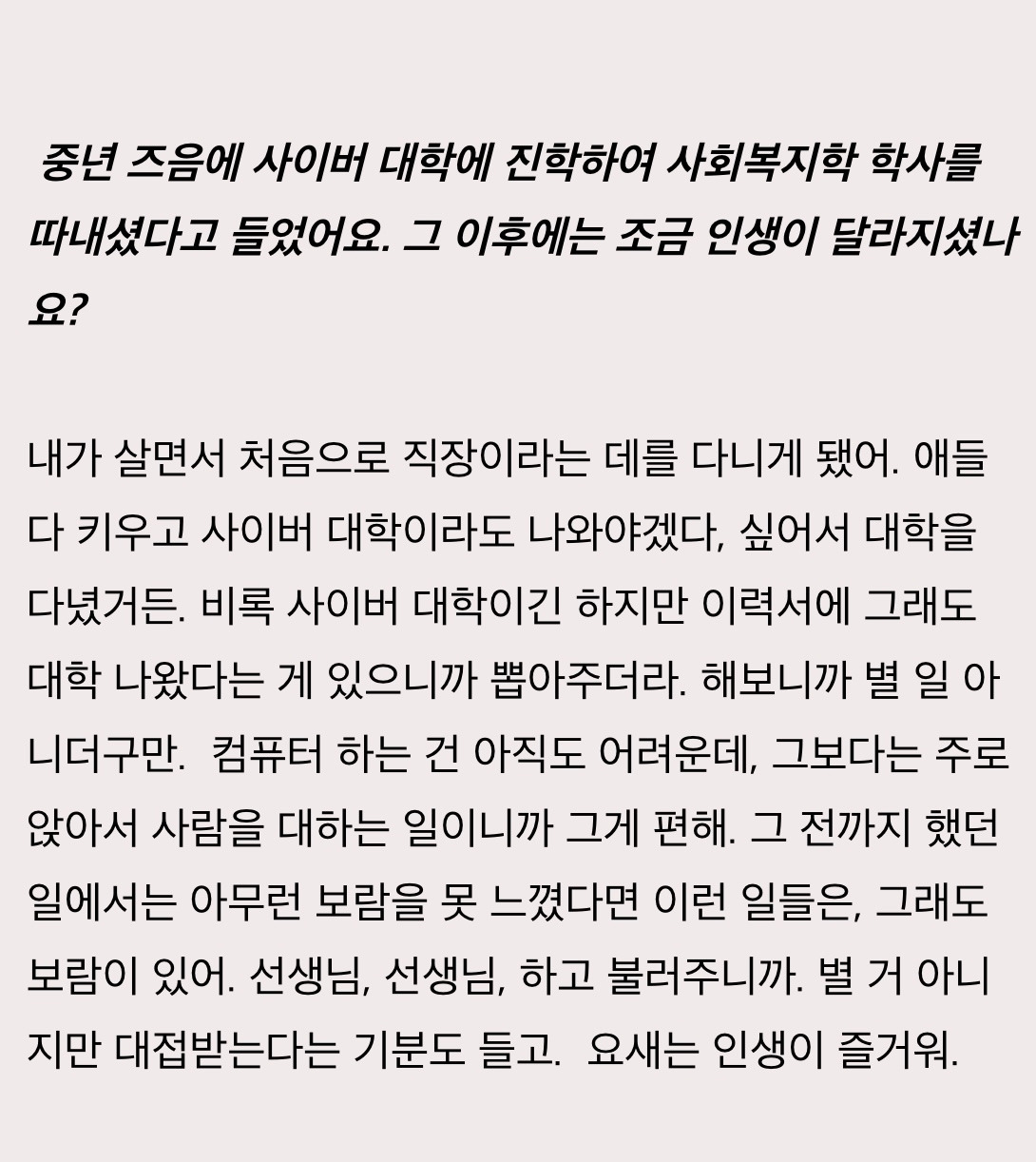 그녀는 중년 즈음에 사이버 대학에 진학하여 사회복지학 학사를 따냈다. 그 이후의 그녀의 인생은 조금씩 달라지기 시작했다. 그녀에게 중년이란 아이를 다 키워내고, 새로운 여유를 가지고 처음으로 자신의 삶을 살아볼 수 있는 기회를 의미하기도 했다. 실제로 인터뷰에서 사회 복지학 학사를 따기 위해 함께 수업을 들었던 여성들 중 많은 수의 여성들이 중년의 여성이었다는 정보를 얻을 수 있었다. 20대 초 시절 공장에서 일하며 꿈꾸었던 해방을 비로소 중년에서야 이룰 수 있게 된 것이었다. 공장 노동으로서의 해방, 육아 노동으로서의 해방. 그녀는 그렇게 다시금 새로운 삶을 살아가기 시작했다. 제 2의 인생의 막이 열리기 시작한 것이었다.