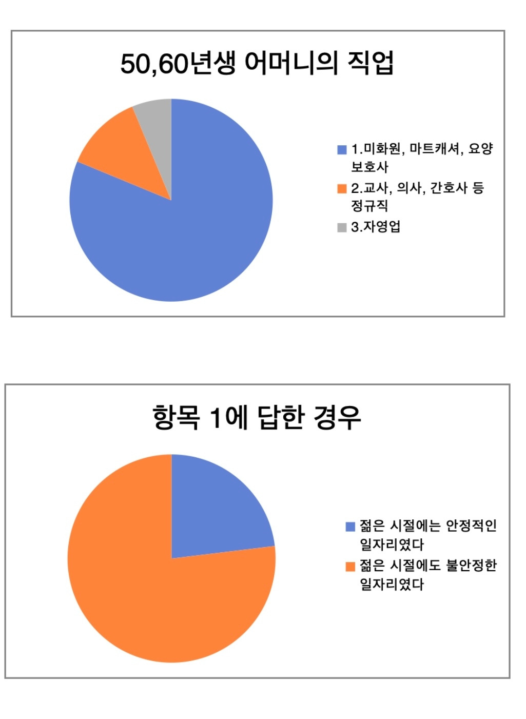 설문 결과 항목 1은 80명 중 57명, 항목 2는 80명 중 18명, 항목 3은 5명이었다. 항목 1이 압도적으로 많은 숫자였다. 항목 1의 답한 57명은 다시 어머니의 젊은 시절 일자리의 안정성에 대한 투표를 해야 했다. 57명 중 40명의 여성이 이전에도 불안정한 일자리였다고 말했으며, 17명의 여성들은 그 이전에는 안정적인 일자리였다. 설문 요약 결과 순이 세대를 이루고 있는 대부분 여성들의 삶은 배우고 싶어도 배우지 못하고 평생토록 불안정한 일자리를 전전할 수밖에 없었던 경우가 많았다. 당장의 먹고 사는 문제에 급해 생계 전선에 뛰어든 여성들은 대부분 결혼 후 직장을 그만둔 뒤 어느 정도 아이가 큰 후에 새로운 일자리를 구하는 식이었다. 이들이 새롭게 구하게 된 직장은 대개 환경 미화, 요양 보호사, 마트 캐셔와 같이 비정규직 직업군이 다수를 차지했다.