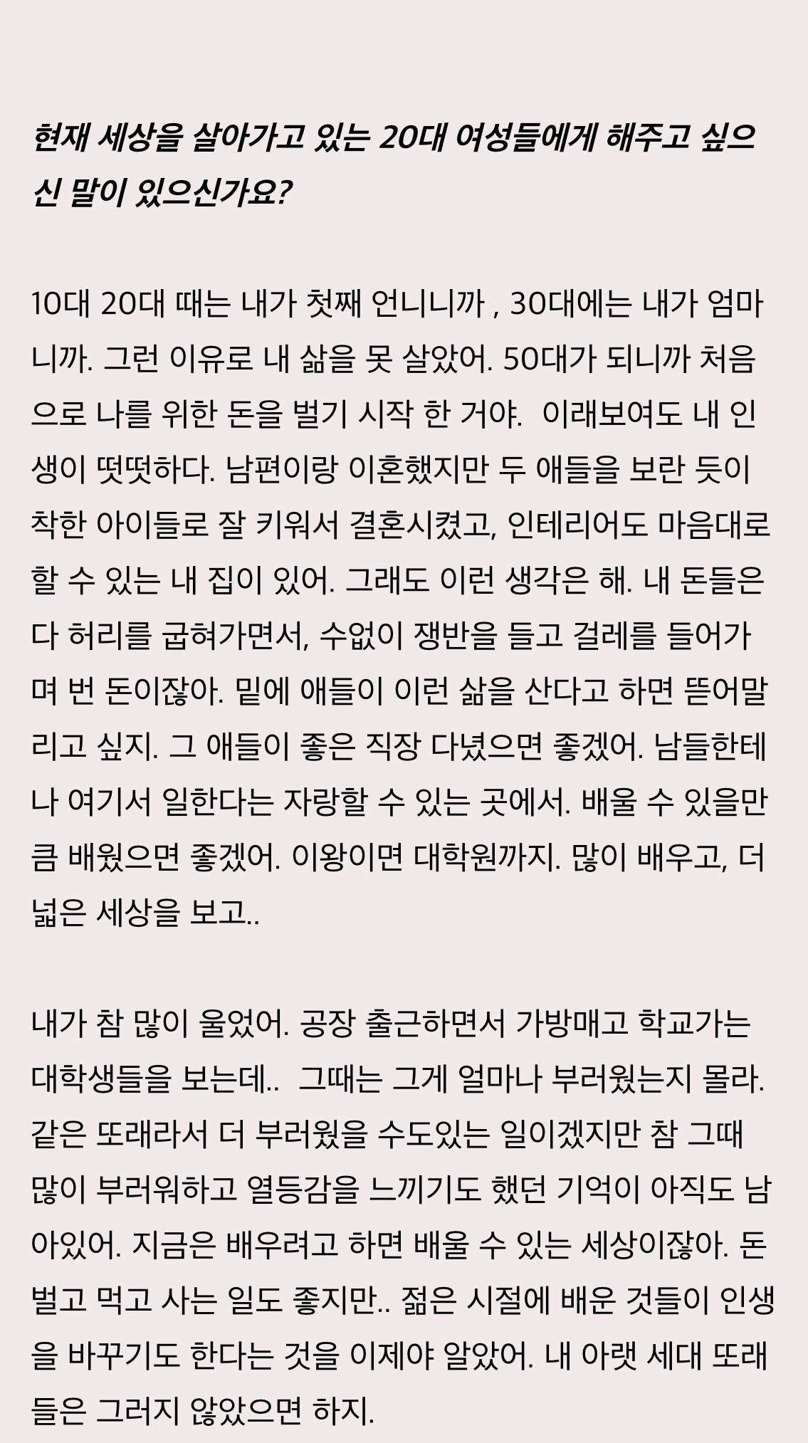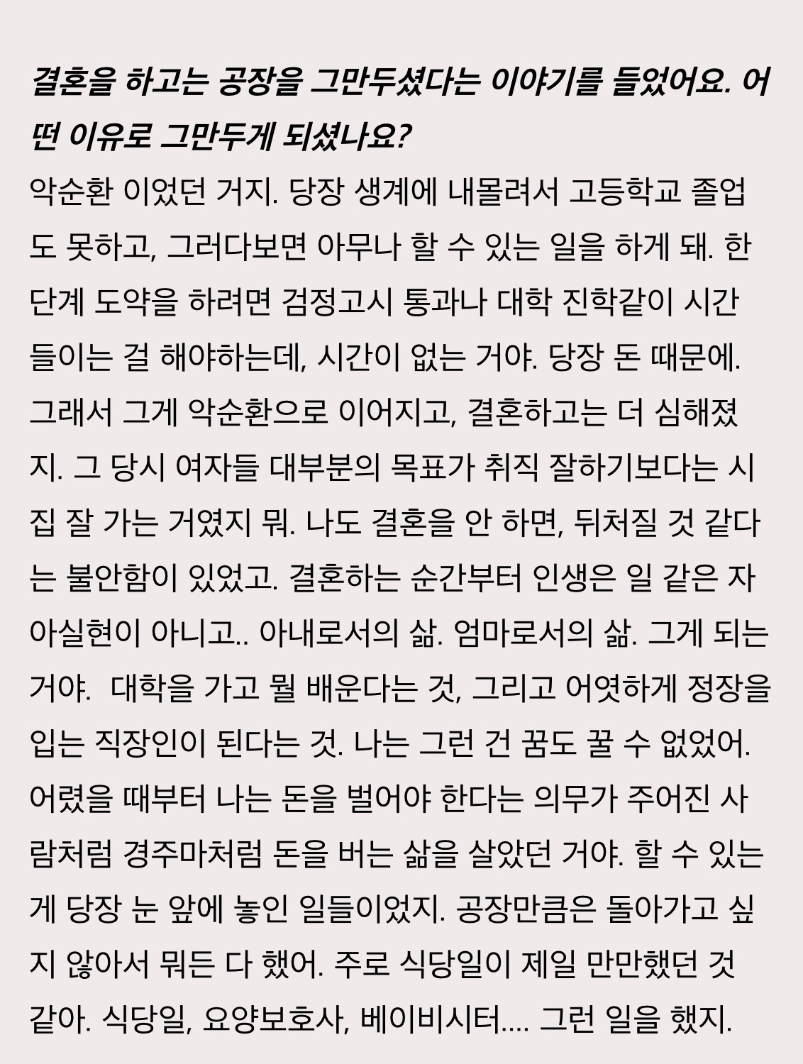 그녀는 마지막으로 현재 20대 여성들이 살았으면 하는 삶에 대해 이야기 했다. 헤어 나오기 힘든 가난과 장시간의 노동, 힘든 노동환경, 인간적인 대우를 받지 못하는 모독 등은 그녀를 비롯한 감수성이 예민한 젊은 여성들에게 커다란 상처와 상대적인 박탈감을 갖게 했다. 특히 꿈이 많은 여성 노동자에게는 견디기 힘든 삶이었을 것이며, 지나가는 학생들을 보며 커다란 박탈감을 느꼈던 삶이었을 것이다. 그러나 그녀는 자신의 인생을 연민하지 않았다. 평생 자식을 위한 돈을 벌었지만 중년인 지금은 본인을 위한 돈을 벌게 되었다는 점에서, 그리고 누군가에게 도움이 되는 삶을 살게 되었다는 점에서 뿌듯해하는 모습을 보였다. 그녀는 돈을 모아 언젠가는 자신의 지역에 작은 센터를 열고 싶다는 꿈도 전했다. 앞으로 그녀의 인생에서 행복한 일과 보람찬 일이 가득하기를, 그녀가 그녀 본인을 고귀하게 여기는 귀한 마음을 결코 잃지 않았으면 좋겠다는 말을 전하며 인터뷰를 마무리했다.