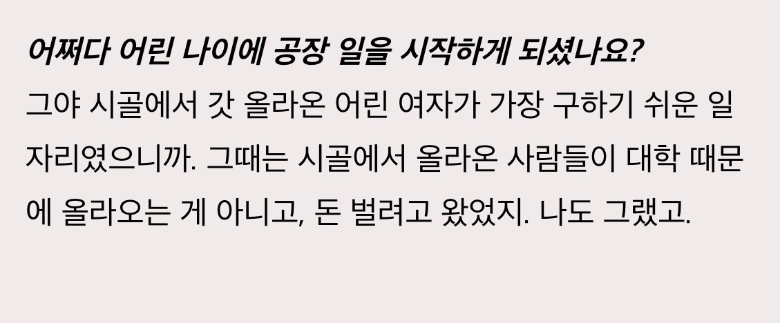 나는 언제나 내가 발을 내딛고 살아가는 세상에는 분명 어떤 누군가의 희생이 있다고 믿는다. 결국 내가 편히 세상을 누리는 것, 자유로이 세상을 살아갈 수 있는 것, 내 목소리를 말할 수 있는 데에는 다른 누군가의 뼈아픈 희생과 노력을 빼놓고는 논할 수 없지 않을까. 직접 온 몸으로 억압과 부조리함을 겪어내며 ‘다음 세대에는 이런 일이 없었으면’ 하는 어떤 이들의 완고한 의지. 나는 그들의 담대한 이야기들을 놓칠 수 없었다. 그렇게 인터뷰를 시작하게 되었다.