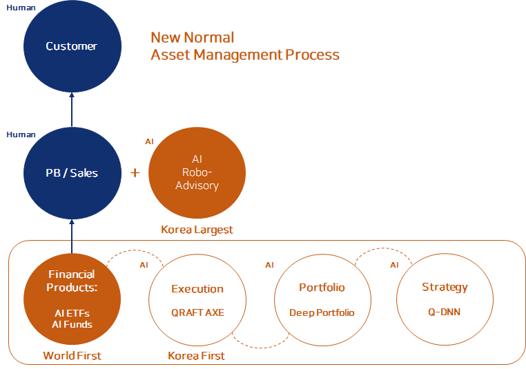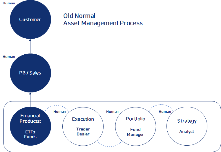 그때가 되면, 대부분의 운용은 passive ETF 또는 AI에 의해 무인운용되는 active beta ETF 가 주요 구성요소가 되고, 로보어드바이저/핀테크앱/은행 및 증권사의 온라인 채널 등이 각자의 기술로 이 구성요소들을 조합하여 최종 소비자에게 제공하는 형태가 될 것이다.