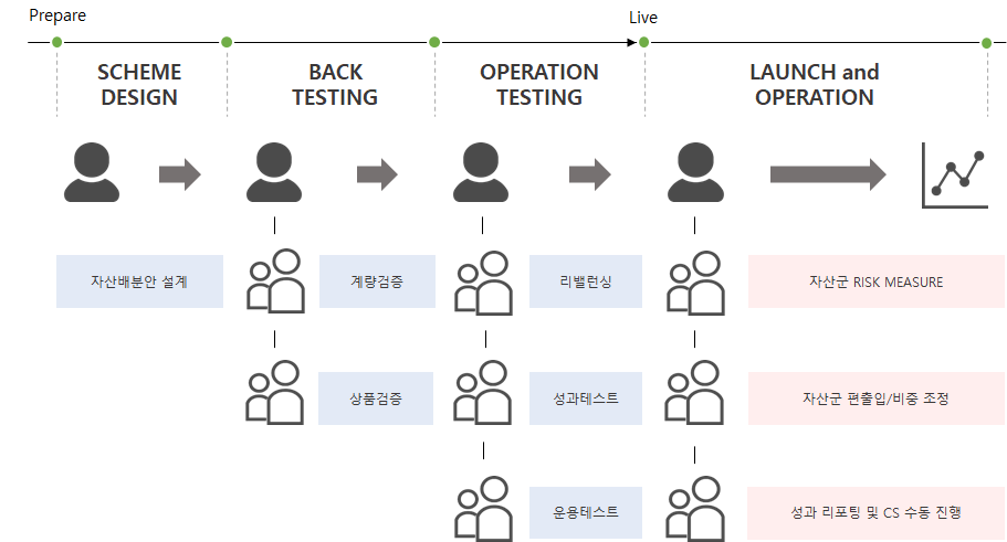 각 기업의 니즈에 맞는 자산운용 서비스, OCIO 서비스를 전통적인 방식으로 제공하려면 많은 인력과 비용이 필요하다. 자산배분 서비스의 예를 들면, 개별화된 자산배분 전략의 설계 및 운용까지의 프로세스는 아래 그림과 같이 길고 복잡하다.