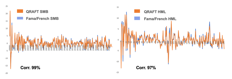 아래 그림은 파마프렌치 모델을 Qraft Kirin API 로 재현한 결과이다. 파마프렌치 모델의 계산식은 모두 공개되어 있고 계산결과도 주기적으로 발표된다. 식과 데이터가 있다면 과거데이터에 대해서는 물론, 리얼타임으로도 계산결과가 발표되기 전에 파마프렌치 모델의 결과를 계산할 수 있다. 그러나, 과거 데이터의 정확도를 확보하지 못해서 과거데이터에 대해 공개된 결과를 정확히 재현할 수 있는 경우는 드물고, 발표되는 결과를 뒤늦게 사용하는 경우가 훨씬 많은 것이 업계의 현실이다.