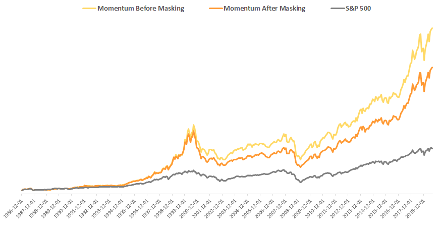 마스킹의 효과를 알아보기 위해, 마스킹 전후의 백테스팅 결과를 비교해보면 아래 그림과 같다.