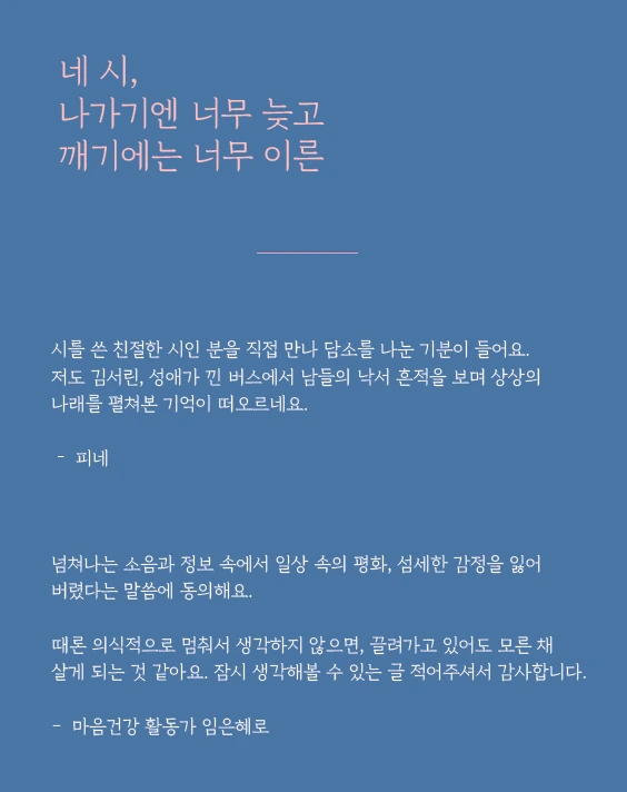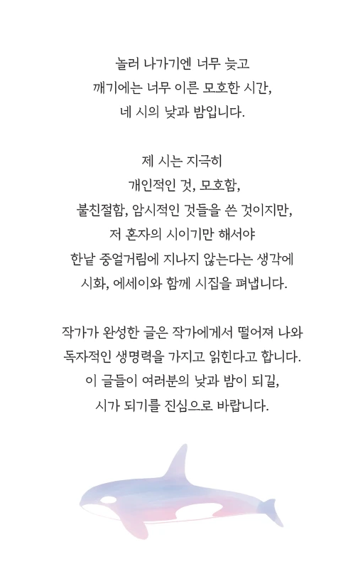 작년에 책 쓰기 워크숍에 참여한 이후 첫 번째 책을 냈고(심리학 관련 실용서) 이번에는 시집을 준비해 출판했습니다. 다행히 첫 번째 책에서 성과가 있었고 홍보도 했으니 이번 책은 특별히 더 도움을 주셔서 원활하게 출간을 진행했던 것 같습니다. 도움 주셔서 정말 감사했어요.
