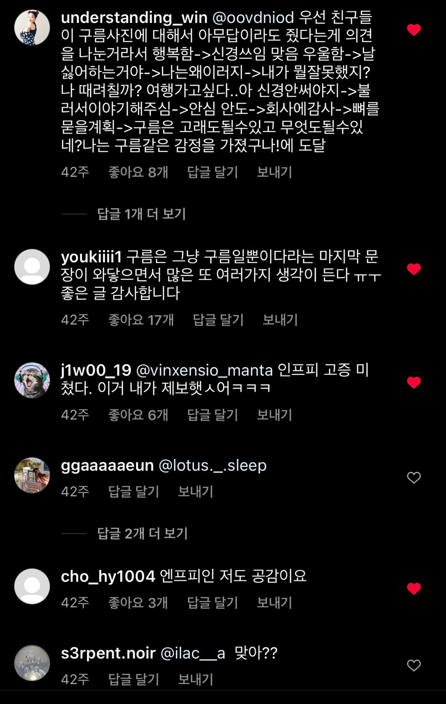 이동건 웹툰 작가는 남자이지만, 유미의 세포들에서 유미의 퍼스낼러티를 생생하게 구현한다. 나는 MBTI를 소재로 INFP 미니픽션을 쓴 적이 있다. 거기 달린 댓글을 보면 이렇다.