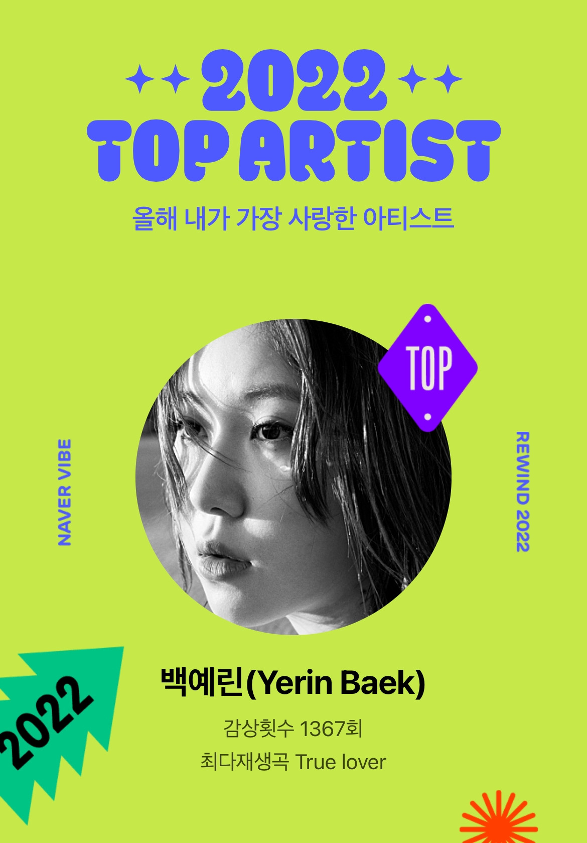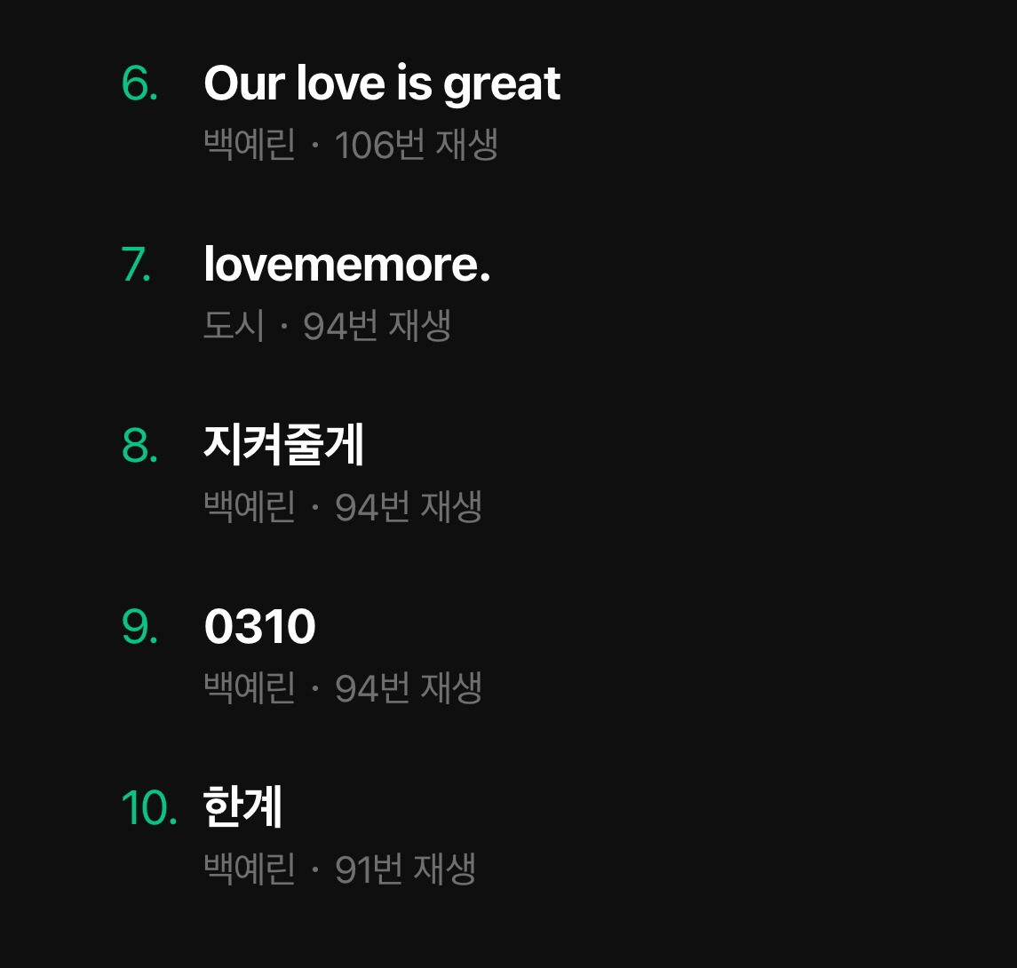 솔직히 아티스트 백예린에 대해서는 아는 게 거의 없다. 어 노래 좋네 하고 들었던 게 쌓여서 저렇게 수치화된다는 게 되게 놀랍다.