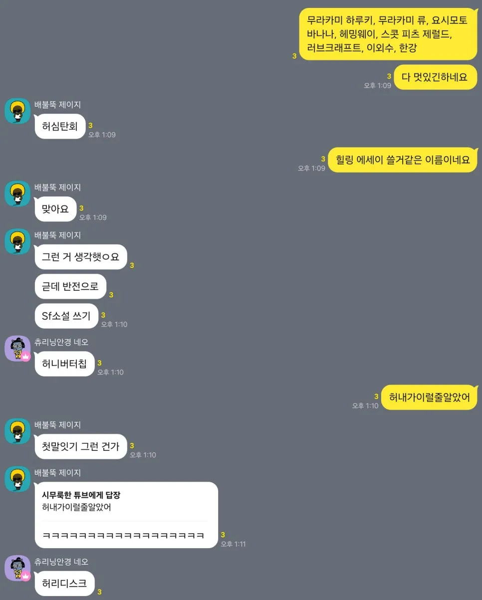 예전부터 생각했던 것이지만, 작가들은 이름들이 참 멋있다. 무라카미 하루키, 무라카미 류, 헤밍웨이, 스콧 피츠 제럴드, 러브크래프트, 이외수, 한강 등등- 원래 이름이 개성이 없으면 필명을 만들기도 한다. 요시모토 바나나는 무명시절부터 세계시장 진출을 염두에 두고 세상 사람들이 모두 좋아할 만한 이름으로 '바나나'를 선택했다. 이런 노력조차도 작가의 자질이 아닐까?