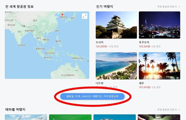 네이버 항공권을 검색해 들어오게 되면 메인창에서 항공권을 검색할 수 있는데요. 여기서 항공권을 더욱 저렴하게 구매를 하고 싶다면 이곳에서 검색하는 것이 아닌 아래쪽 '출발일, 지역, 소요시간, 여행기간, 가격 맞춤검색' 탭을 이용하시길 추천드립니다.