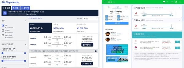 스카이스캐너는 국내외 여행사 모두 비교하며 많이 나오고, 네이버 항공권에서는 국내 여행사 위주로 많이 비교한다는 차이점도 가지고 있는데요.