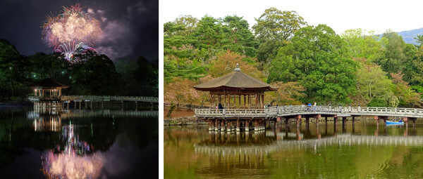 근방을 배회하는 멋진 뿔의 사슴들로 하여금 포인트가 되어 아름다운 인생사진 명소가 되어줍니다. 특히 겨울 야마야키 행사 때의 불꽃놀이 기간에 방문하게 되면 연못에 불꽃놀이가 비치며 더욱 아름다운 모습이 연출되니 참고해 주시기 바랍니다.