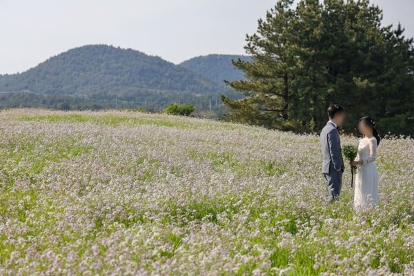 성읍갯무꽃밭은 4, 5월이면 매우 아름답게 피어오른 갯무꽃들로 인해 매우 아름다운 풍경을 자아내기로 유명한데요. 이곳은 연보랏빛의 갯무꽃들이 초원을 모두 뒤덮듯 펼쳐져있는 웨딩촬영의 성지와도 같은 곳입니다.