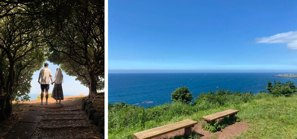 오르는 길에 바다를 배경으로 사진을 찍어도 좋고, 키세스존이라는 나무터널 아래에서 사진을 찍어도 옷이 살랑거리며 매우 아름답게 사진을 찍을 수 있어 어딜 가나 포토존이라고 할 수 있는데요.