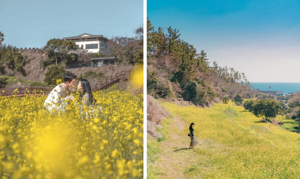 이곳은 울타리가 있는 나무 데크 산책로가 조성되어 있어 웨딩드레스를 입고도 쉽게 방문하기 좋으며, 노란 유채꽃밭에서 푸르른 하늘을 배경으로 웨딩사진을 찍게 되면 더욱 풍성한 분위기를 느끼실 수 있을 것입니다.