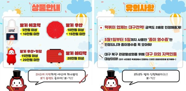 행사 방법은 5월 1일부터 5일까지 대구 북구 지역을 여행하며 종이 영수증을 떡페 굿즈샵에 제출하면 끝인데요. 사용한 금액별로 다양한 경품을 얻을 수 있는 특별한 행사입니다.
