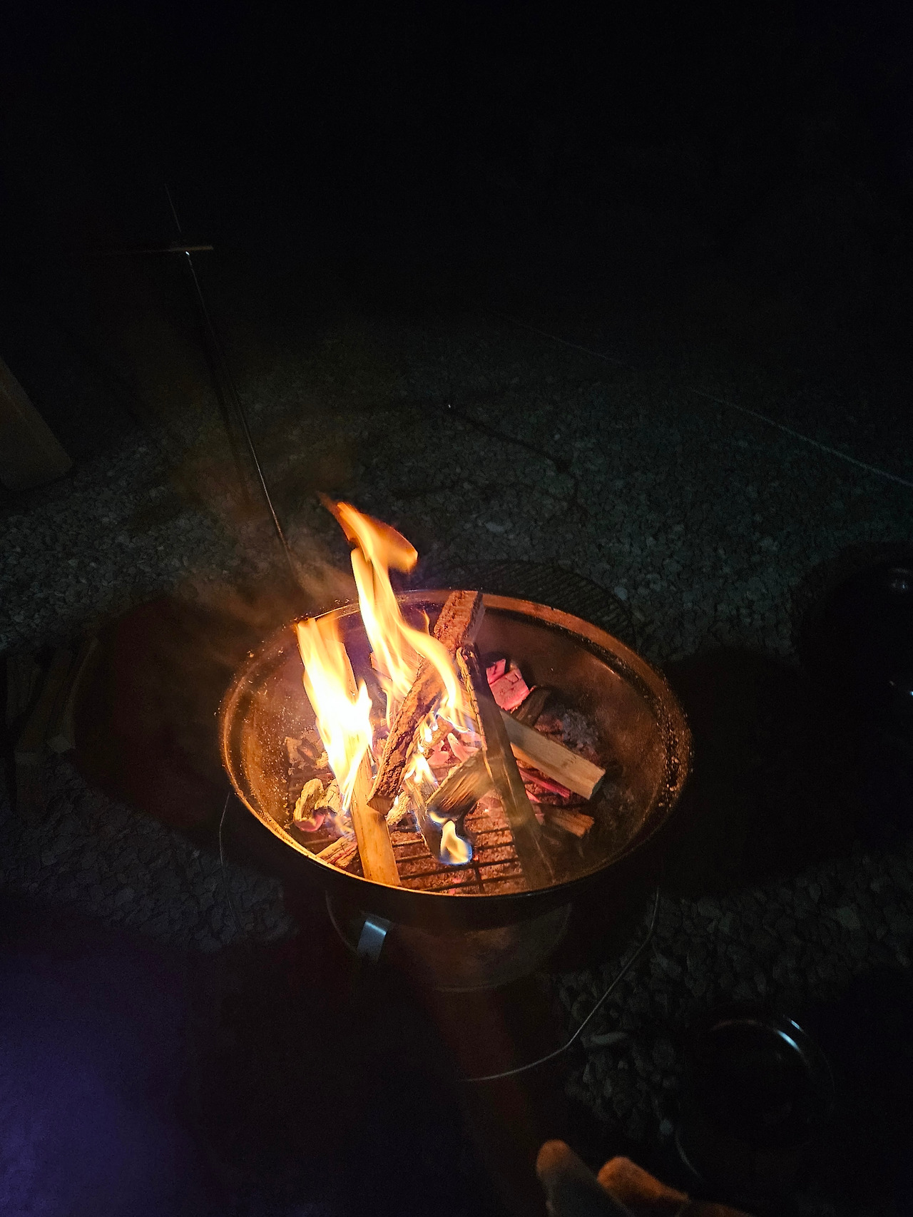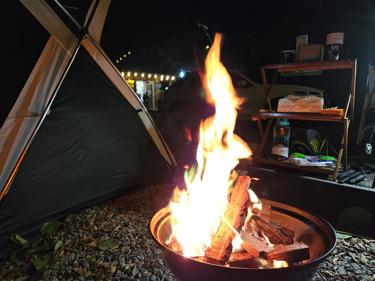 모든 걱정과 우려를 뒤로하고 다행히 시원한 바람이 불고 맑은 캠핑을 즐길 수 있었다. 오랜만에 쳐보는 텐트를 몇 번의 시행착오 끝에 말끔히 정리하고 모닥불을 피워 불멍을 하다가 허기가 져서 두툼한 목살을 굽기 시작했다. 캠핑은 올 때마다 생각하는 거지만 차리고 먹고 치우다 끝나는 게 캠핑인 것 같다. 캠핑의 묘미를 모르는 분들은 고작 텐트를 치고 먹고 놀다가 다시 짐을 싸서 돌아오는 게 뭐가 재미있겠냐라고 하겠지만 사실 말 그대로가 참 재미있다. 텐트를 몇 번이고 쳐봐도 항상 헤매고 늘 다른 시행착오를 겪다가 성공하면 그렇게 뿌듯할 수가 없다. 놓치고 온 물건이 있어서 아쉽기도 하고 챙겨 온 물건이 쓸모 있어서 우습기도 하다. 두툼한 목살을 맛있게 구워 먹다가 질리면 새우나 소시지를 구워 먹기도 하고 고구마나 감자를 포일에 감싸서 장작옆에 슬며시 놓아둔다. 그러다 따뜻한 국물이 생각나면 없는 재료에 막 썰어 넣은 김치찌개도 그렇게 맛있을 수가 없다.