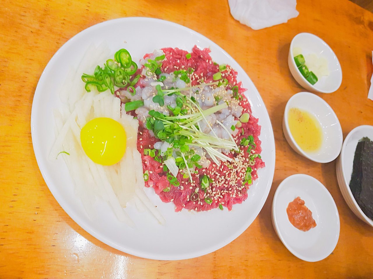 흔히들 그렇게 말한다. 먹을 것의 종류는 3가지로 나뉜다고 바로 육, 해, 공! 이 말의 대표적인 뜻은 고기와 해산물, 그리고 닭고기를 의미한다. 누군가가 셋 중에 하나를 고르라고 한다면 나의 일 순위는 무조건 해산물이었다. 그리고 그다음으로 꼽자면 바로 닭고기. 그렇게나 나에게 고기는 뒷전이었다. 물론 삼겹살과 소고기를 맛있게 먹지만 그래도 해산물과 닭고기보다는 항상 뒤로 처지는 게 고기였다. 그런 나에게 육해공의 순서 따위는 다 뒤집어 버린 메뉴가 하나 있다면 그것은 바로 육회와 육사시미다.