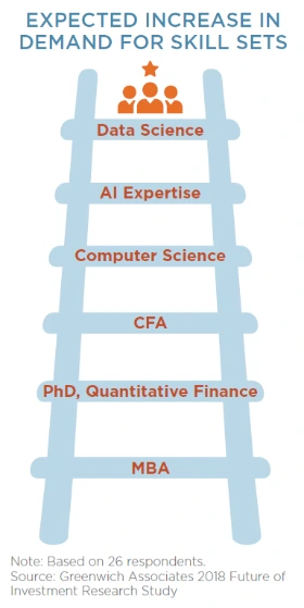 결국 투자업계의 변화는 데이터, 데이터 애널리틱스나 인공지능 기술에 대한 수요 증가를 야기할 것이고 점점 더 많은 금융회사들이 이 분야에 대한 역량 집중과 예산 배분 증가를 계획할 것으로 이번 레포트는 전망하고 있다.