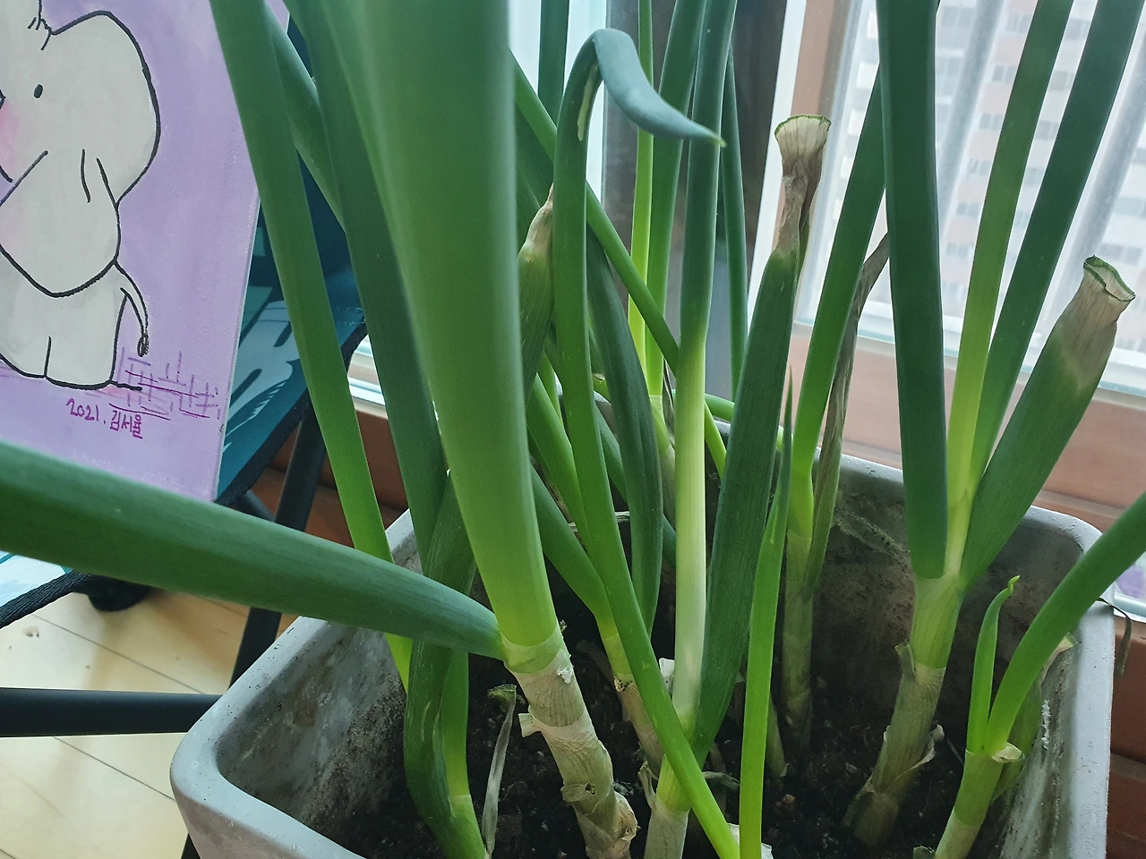 날이 따뜻해지면서 보관방법을 바꾸었다. 안 쓰는 화분에 앝게 심기로 했다. 오래 버텨만 주면 된다는 생각에 화분에 파 한 단을 통째로 넣고 심어서 보관하고 있다.