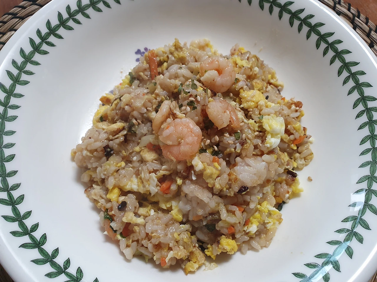 파와 계란을 꺼내 든다. 파를 잘게 다져 식용유를 두르고 충분하게 볶아낸다. 노릇하게 볶아지면 파기름이 만들어진다. 파를 프라이팬 한 켠으로 몰고 계란 3개를 깨뜨려 넣는다. 휘이휘이 저어 계란 스크램블을 만들어준다. 냉동실에 있던 냉동새우도 같이 볶아준다. 뜨겁게 달궈진 팬에 간장 한 숟가락을 끼얹고 간장의 향을 입힌다. 그리고 식은 밥을 턱 넣어주고 잘 볶아준다. 맛소금을 넣어 간을 맞추어도 좋고, 굴소스가 있다면 약간 넣어서 볶아준다. (굴소스는 많이 넣으면 짜다.) 막내 녀석의 허기를 달래주는 소박한 달걀 볶음밥이다.