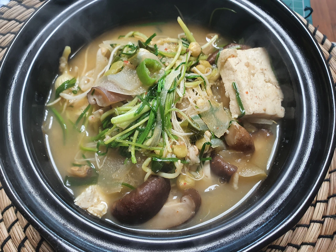 버섯, 두부를 한웅큼 먹고 푹 끓인다. 칼칼하게 먹고 싶어 청양고추를 썰어놓고 고춧가루도 한스푼 넣어준다. 적당히 끓인 후에 달래를 가득 올려주었다.
