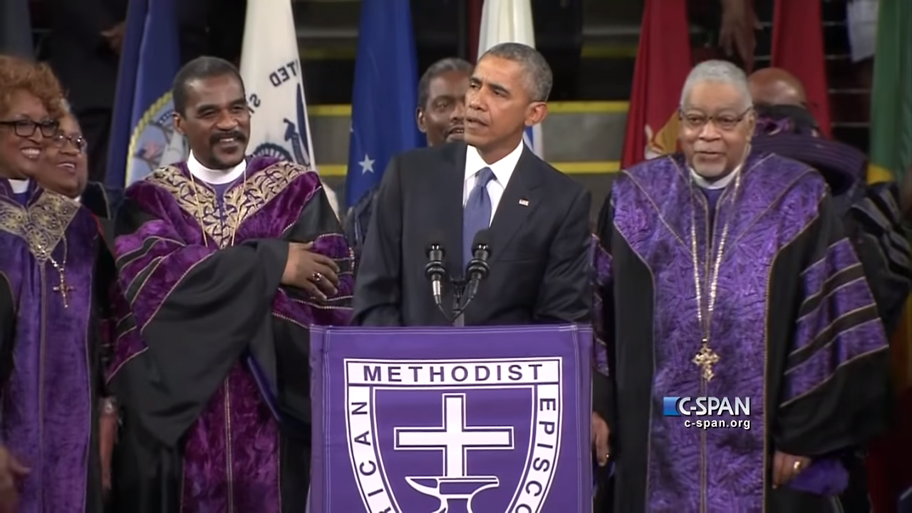 희생자를 기리는 장례식장에 흥분한 흑인들이 몰려들었고, 흑인 대통령 오바마가 섰다. 오바마는 희생자를 위로하고 추모해나갔다. 연설 말미에 그는 말을 잠시 멈춘다. 미국과 전 세계의 이목이 집중된 그 순간, 사전에 의도된 침묵이 흘렀다. 오마바의 입에서 나지막이 노래가 흘러나온다.