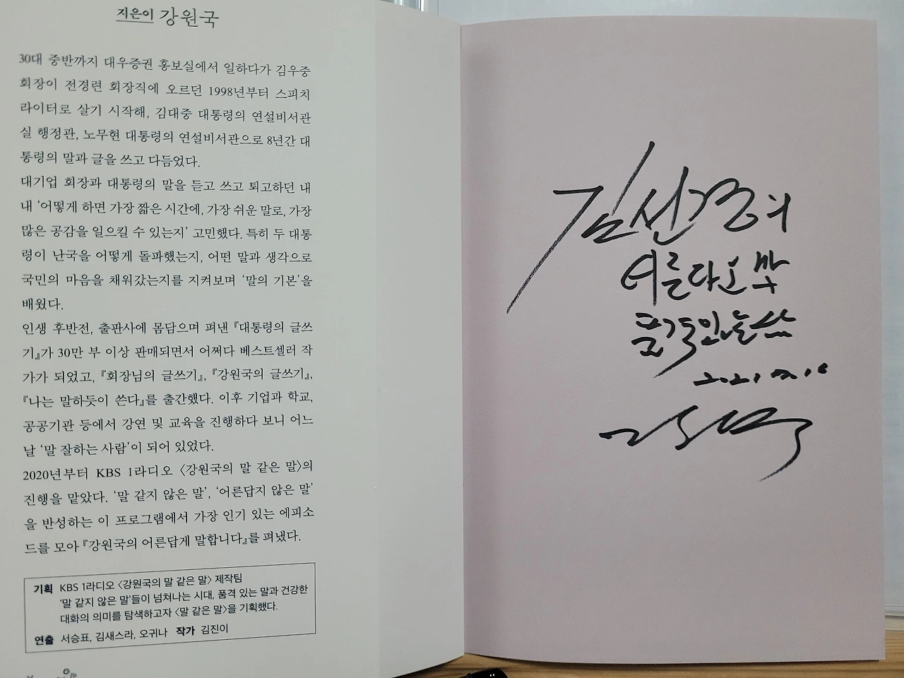 책을 쓰면서 가장 여러 번 읽은 책이 강원국 작가님 책이다. 글쓰기에 대해 도움을 받았다. 회사에서 강원국 작가님을 강사로 모셨다. 강원국 작가님은 온라인 강의를 통해 자신만의 글쓰기 비법을 공유했다. 반가운 마음에 여러 가지 질문도 하고 조언도 많이 받았다. 신간 <강원국의 어른답게 말합니다.>에 저자 사인을 받기도 했다.