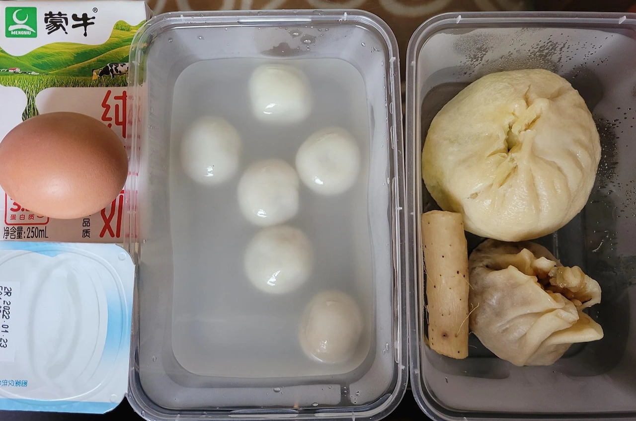 아침에 격리된 호텔방으로 배달되어 온 중국식 도시락이다. 우리가 잘 모르는 스타일의 국물, 만두류, 삶은 계란, 요거트, 우유이다.
