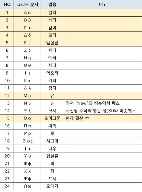 알파(α) 바이러스 → 베타(β) 바이러스 → 감마(γ) 바이러스 → 델타(δ) 바이러스 → 엡실론(ε) 바이러스 → 뮤(μ) 바이러스