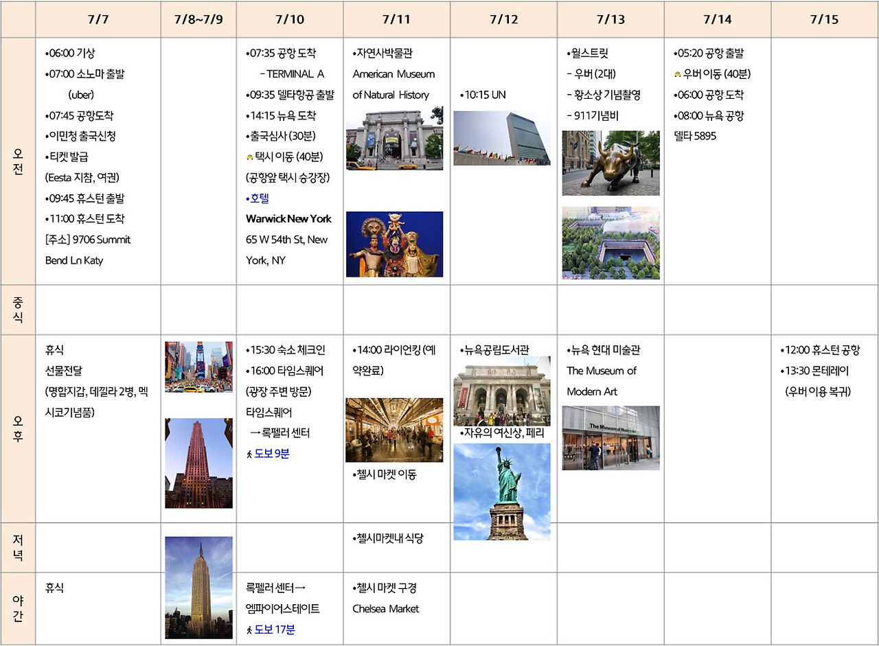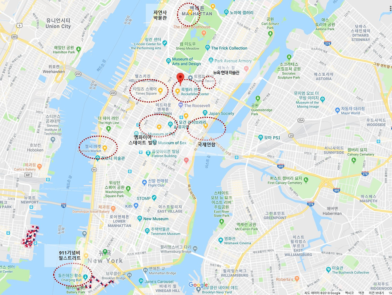 2018년 떠났던 필자의 뉴욕 여행을 예로 들어보자. 타임스퀘어 광장, 록펠러 센터, 엠파이어 스테이트 빌딩, 자연사 박물관(영화 <박물관은 살아있다>의 배경), 라이언킹 공연, 첼시마켓, 국제연합(UN), 월 스트리트, 뉴욕 현대미술관을 방문했다.