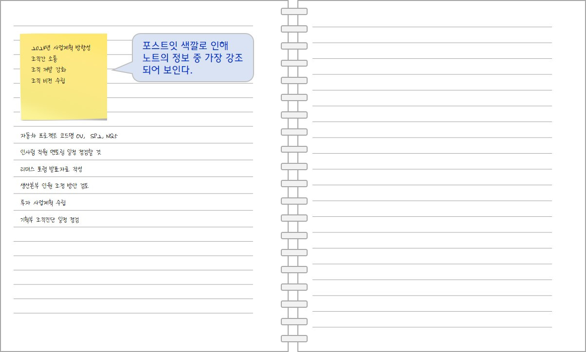 포스트잇은 색깔이 있다. 포스트잇의 색깔로 인해 강조 기능이 있다. 중요한 일정을 포스트잇으로 작성하여 붙여두면 눈에 확 띈다. 중요한 일정은 포스트잇에 적고 필요할 때 이동하여 부착하기도 한다. 포스트잇은 노트 페이지내에서도 가장 눈에 잘 띈다. 이렇게 하면 일정을 시각적으로 관리할 수 있다.