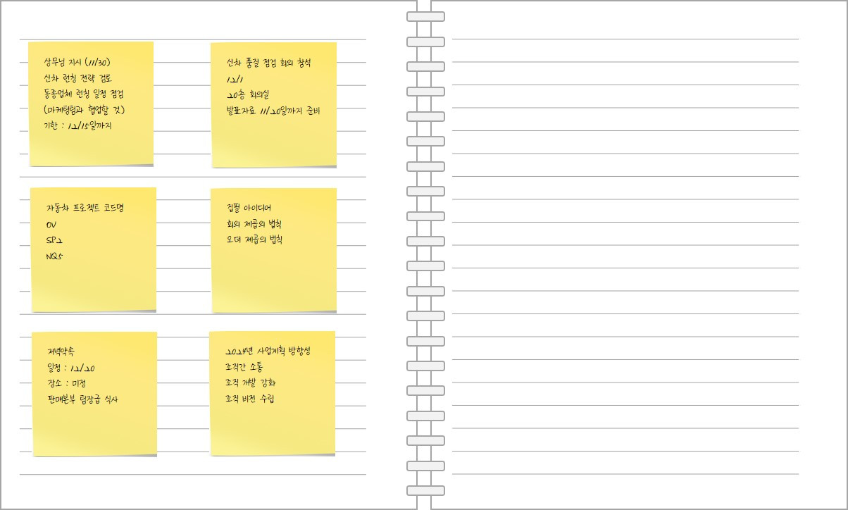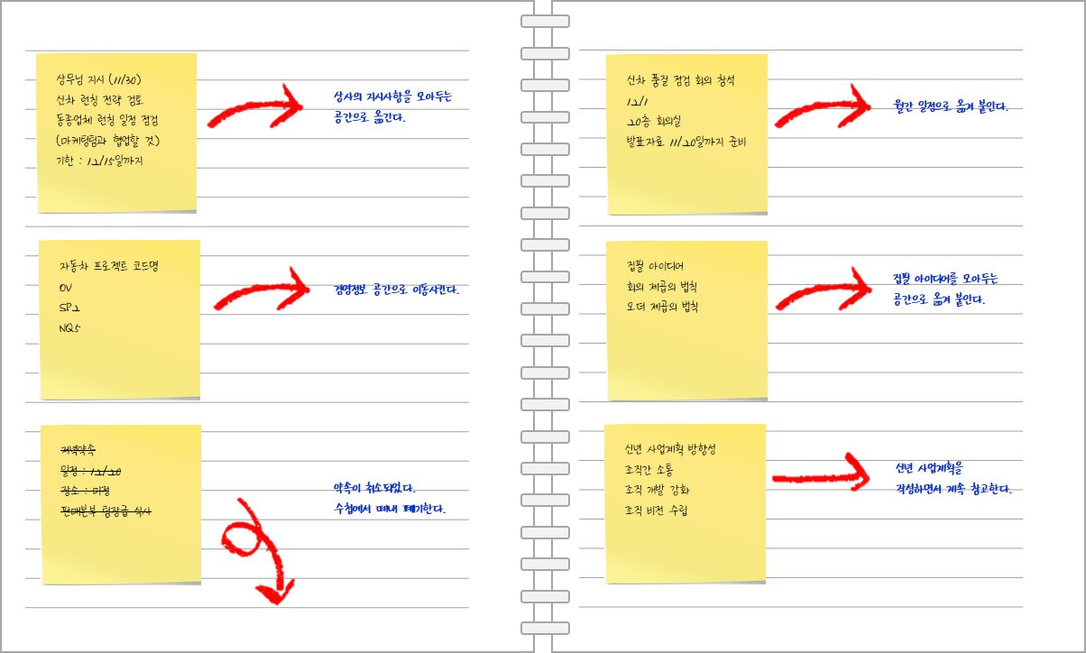 포스트잇은 쉽게 떼어낼 수 있다. 회사 일을 하다보면 변경사항은 항상 생길 수 있다. 메모를 일일이 다시 적는 것은 귀찮을 수밖에 없다. 디지털 환경(디지털 플래너, 원노트 등)에서 일정관리를 한다면 일정을 수정하는 것이 간단하다. 아날로그 노트에 수정하는 것은 생각보다 번거롭다. 고정된 일은 바로 노트에 적는다. 변경이 자주 있을법한 일정은 포스트잇에 적어둔다. 포스트잇 메모는 다른 노트 페이지로 쉽게 옮겨 붙일 수 있다. 쉽게 수정/변경/일정 이동이 가능하다. 이미 처리가 끝난 정보는 떼어내서 폐기할 수도 있다. 노트 정리가 깔끔해진다.