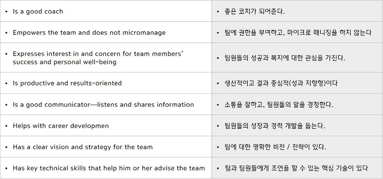 아래는 구글이 이야기하는 좋은 리더의 조건 8가지다.
