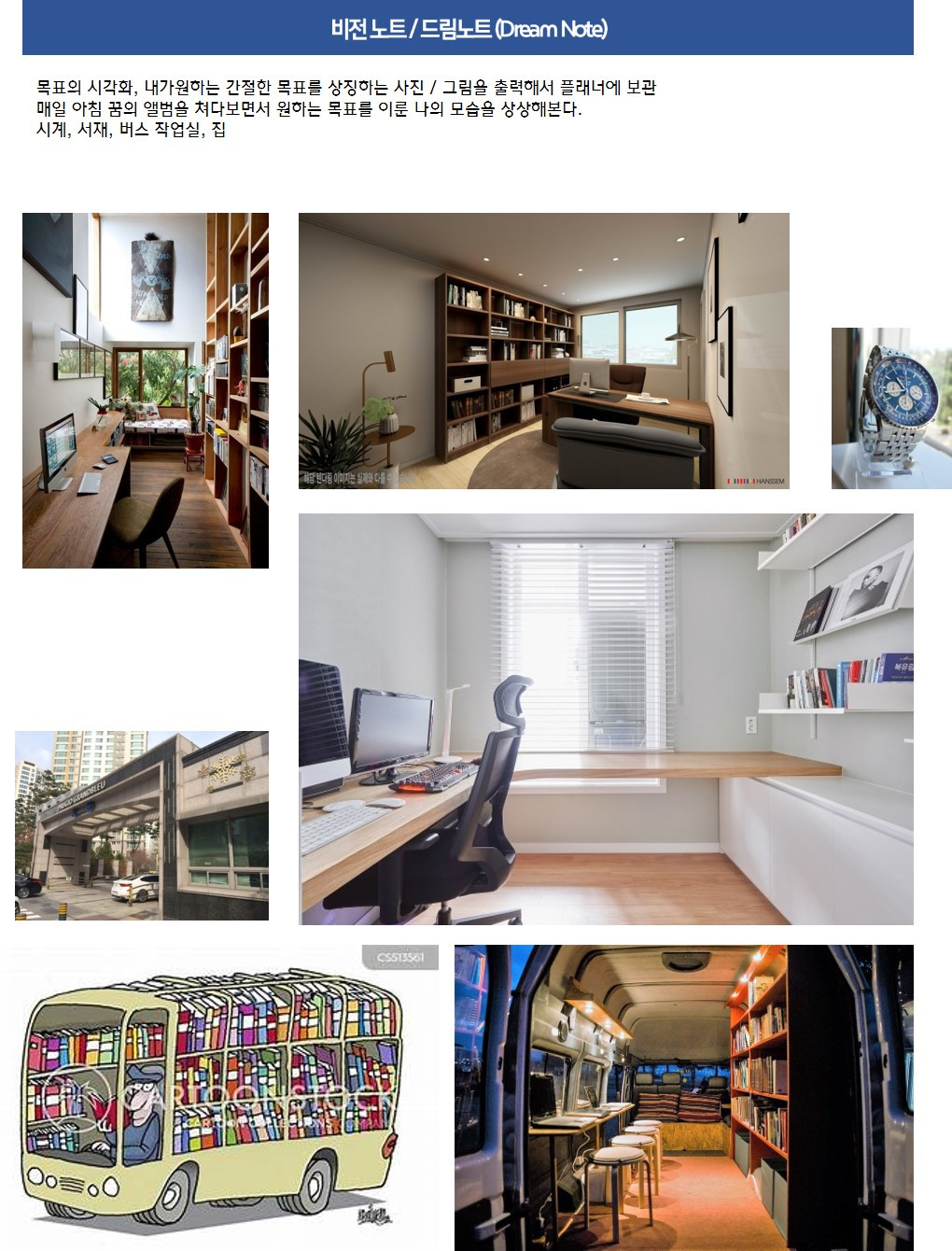 비전보드는 그림을 활용하기 때문에 즐겁게 할 수 있다. 원하는 것의 사진이나 이미지를 검색해서 노트에 붙이는 것은 줄거움을 준다. 필자의 경우 사고 싶은 시계, 가지고 싶은 서재, 살고 싶은 집 사진을 붙여두었다.