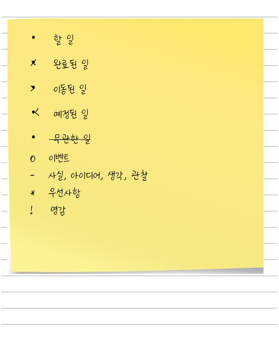 노트에 관한 저서 <블렛저널>에서도 기호의 필요성을 언급하고 있다. <블렛저널>의 저자가 소개하는 기호는 아래과 같다.