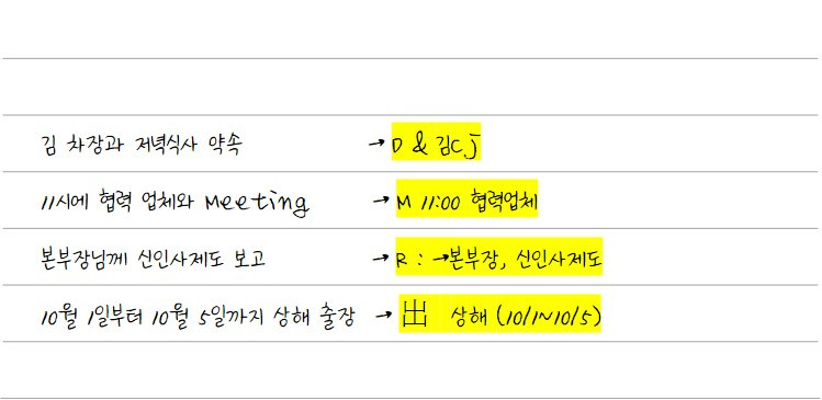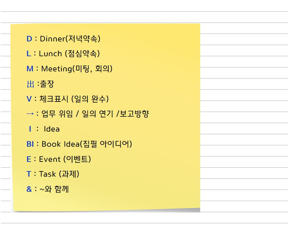 특히 회의나 상사의 업무 지시 상황 등 빠르게 정보를 기록해야 할 때 유용하다. 긴 단어를 모두 작성하고 있으면 핵심 정보를 기록하는데 소홀하게 된다. 노트 공간을 절약할 수도 있다. 더 많은 정보를 한 페이지에 기록할 수 있다.