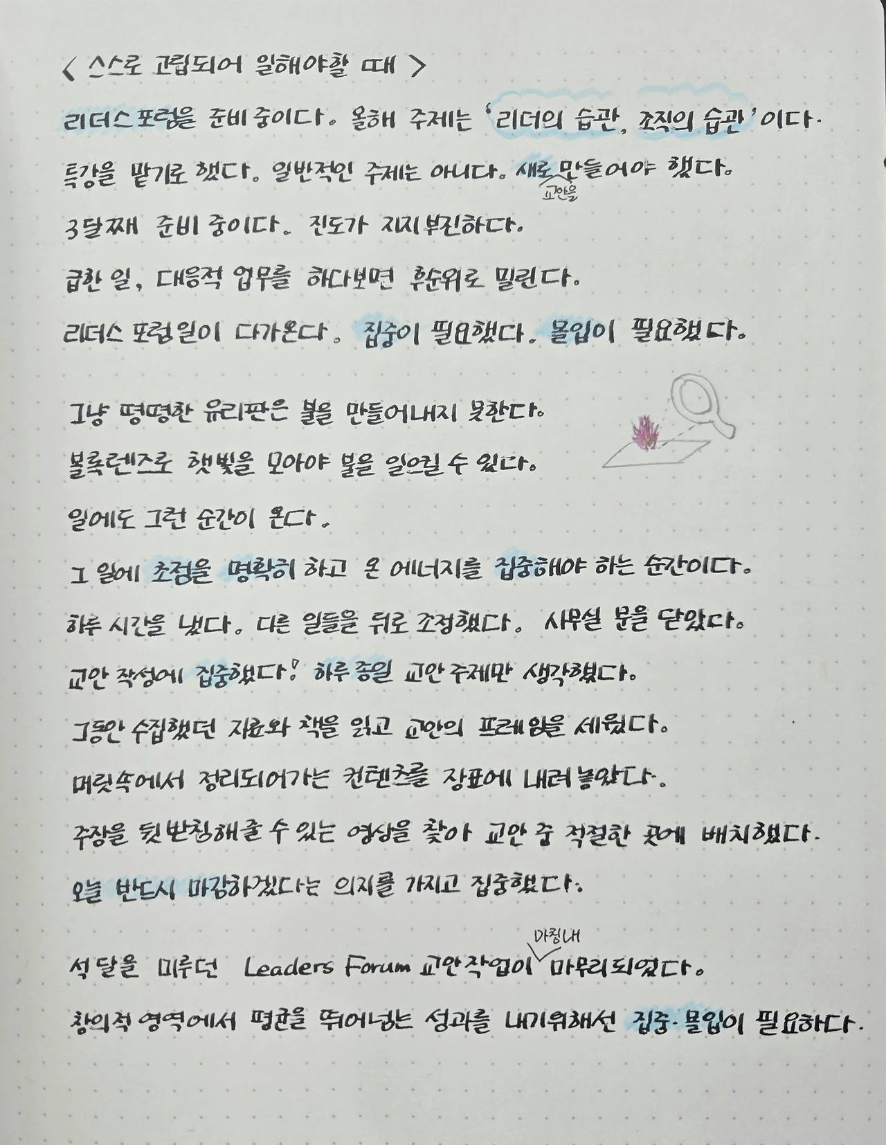 회사에서 리더스 포럼을 준비 중이다. 올해 주제는 '리더의 습관, 조직의 습관'이다. 특강을 맡기로 했다. 일반적인 주제는 아니다. 새로 교안을 만들어야 했다. 3달째 준비 중이다. 진도가 지지부진하다. 급한 일, 대응적 업무를 하다보면 후순위로 밀린다. 리더스 포럼 일이 다가오고 있다. 집중이 필요했다. 몰입이 필요했다.