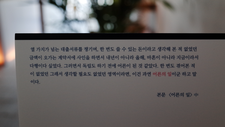'이렇게 어른이 되는 건가?' 싶었던 순간과 '과연 어른의 일이군!' 하고 깨달았던 시간을 담은 에세이입니다. 오래 전부터 온라인 공간에 글을 써 왔습니다. 이제는 아무도 안 써서 더 애틋해진 싸이월드에 여전히 글을 올리고 있고, 검색 당하고 싶은 글들은 네이버 블로그에 씁니다. 나를 아는 사람은 읽지 않았으면 좋겠지만 그래도 누군가는 봐주길 바라는 글은 익명으로 텀블러에 쓰고 있습니다. 목요일의 글쓰기를 시작하면서는 브런치에도 글을 올리고 있죠. 그렇게 써 온 글 중에 그래도 좀 완성도가 있다 싶은 글을 추려내었습니다. 그 중에 독립하면서 썼던 <어른의 일>이라는 글이 있었고, 골라놓은 글들이 그 제목 아래 얼추 엮일 것 같아서 엮어버렸습니다. 오래 고민하진 않았지만 대부분 이전에 없던 일들을 겪느라 힘들 때 쓴 글, 즉 어른이 되어가며 쓴 글이라 이렇게 엮일 운명이었다고 믿고 있어요.