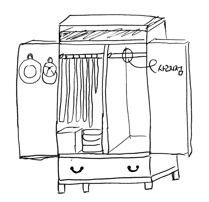 이사를 하고 보니 옷장은 생각보다 괜찮았다. 위쪽에는 손님용 침구가 들어갈 정도의 선반이 있었고 그 아래로 양쪽으로 공간이 나뉘어 옷을 걸 수 있는 봉이 각각 하나씩 있었다. 긴 옷을 걸어도 바닥에 끌리지 않는 높이라 원피스나 코트가 많은 내게 딱 맞았다. 그 아래로는 문을 여닫을 수 있는 서랍이 한 칸 있어 양말과 속옷을 넣기 좋았다. 그닥 크지 않은 옷장 하나에 많은 것이 들어갔다. 옷을 걸고 남는 아래쪽 공간에는 티셔츠와 운동복 등을 개어 넣었고, 몇 안되는 모자는 옷장 문에 붙은 간이 고리에 걸었다. 옷장은 다리미와 스카프까지 다 받아주었다. 점점 옷장이 좋아졌다.
