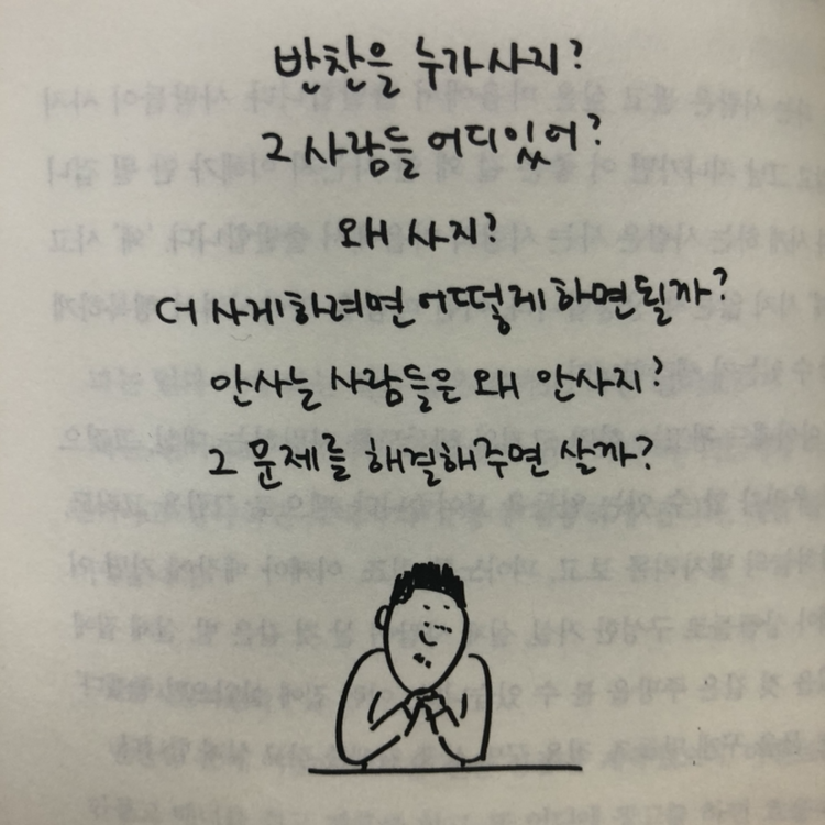 이 책을 누가 사지? 그 사람들 어디 있어? 왜 사지? 사게 하려면 어떻게 하면 될까? 안 사는 사람들은 왜 안 사지? 작가님의 질문을 따라 고민해본다.
