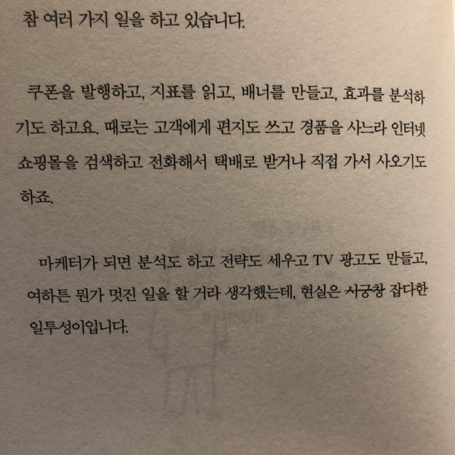<책 잘 읽는 방법>에 (김봉진 작) 책에서 변명을 찾지 말라는 조언이 나온다. 그동안 동의하고 공감할 수 있는 책만 골라 읽었던터라 깜짝 놀랐다. 이후로 는 책이 주장하는 바를 무조건 받아드리지 않도록 읽으려고 한다. 하지만 <마케터의 일>에는 내가 함께 겪은 일도 꽤 있어서 과연 비판적인 읽기가 가능한지, 칭찬 일색의 리뷰가 되지 않을지 조심스러웠다.