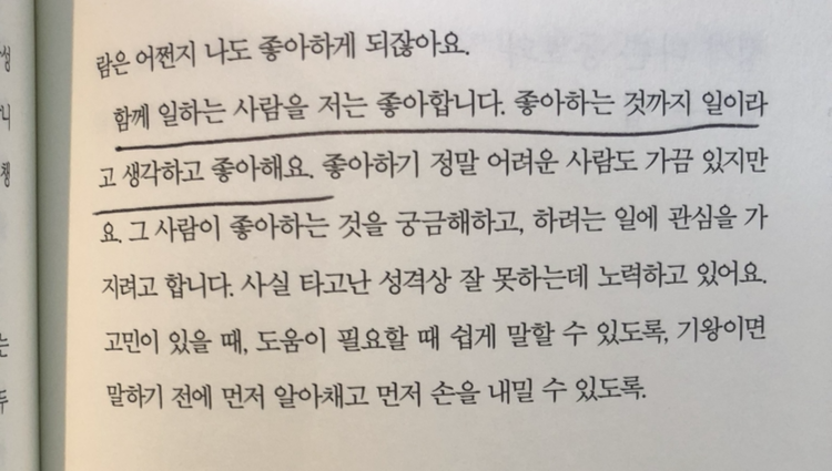 나는 우리 이사님이 또 우리팀이 좋다. 너무 매력적이라 안 좋아할 수 없다. 나는 이사님이, 우리팀 사람들이, 또 우리 회사도 모두 잘됐으면 좋겠고, 행복하길 바란다. 할 수 있는 게 좋아한다는 말 뿐이지만 이 마음도 좀 알아줬으면 싶다. 같이 일하는 사람을 좋아하는 것까지 일이라고 했으니 작가님! 저 일 잘하고 있는 거 맞죠?