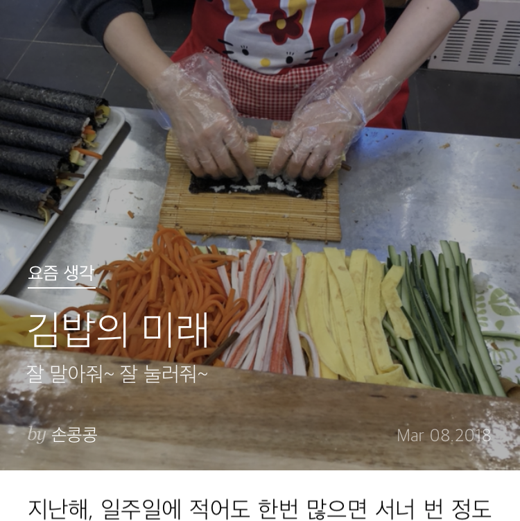 3월에 <김밥의 미래>라는 글을 브런치에 올렸다. 어떤 포인트인지는 모르겠지만 브런치 추천글로 소개 됐고 4만명에 가까운 사람들이 그 글을 읽었다. 내가 가장 오래 공을 들인 글도, 잘 썼다고 생각한 글도 아니어서 좀 의아했다. 가설은 둘 정도. 브런치 유저 중에 ‘김밥애호가’가 많다. ‘김밥’과 ‘미래’의 콘트라스트가 호기심을 자극한다.