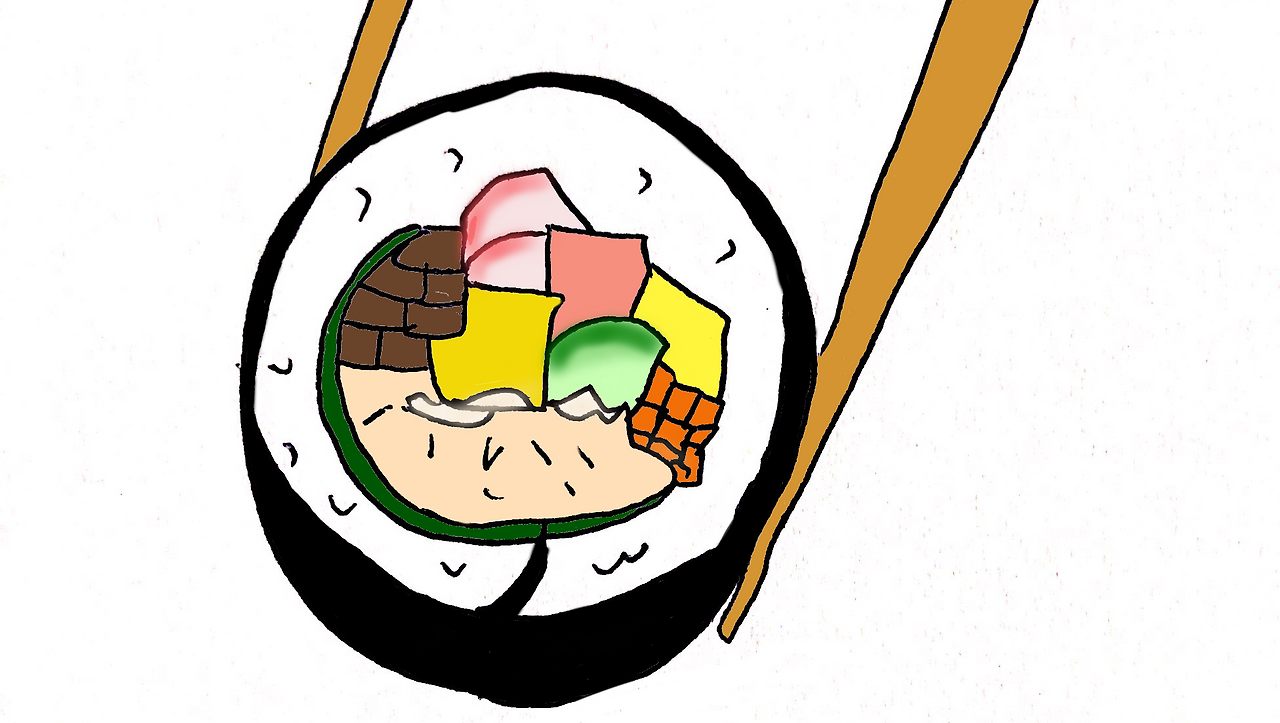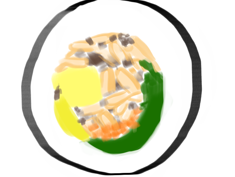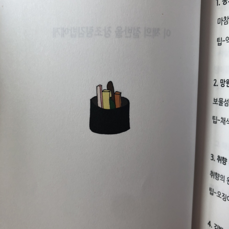 처음부터 김밥을 그릴 생각은 아니었다. 그림 그리기를 좋아하는 친구가 김밥을 그리겠다고 했고, 그 말이 김밥책을 만들기로 결정하는 데 큰 영향을 미쳤다. 결정을 하고 보니 이건 내 책도 친구 책도 아닌 책이 되겠다 싶었다. ‘그럼 내가 그리지 뭐.’ 김밥 사진을 예술로 찍지 않을 바에야 그림이 낫겠고 그릴 사람이 없으니 내가 한다는 판단은 실수였다. 김밥 그림 하나에 글 한 편 쓰는 시간이 들었다. 그나마 김밥을 어떤 식으로 표현할 것인가를 정한 뒤의 시간이었다. 스타일을 찾기까지 며칠이 걸렸다. 해놓고 보니 뿌듯하지만 하는 동안 진땀이 났다. 내가 이걸 왜 한다고 했을까. 마켓이 열리는 날이 정해져 있으니 멈출 수는 없는데 해 뜨는 걸 보면서 편집을 하고 있자니 웃음이 났다. ‘나 지금 뭐하는 거야. 으흐흐흐흐.’ 뭐하긴 김밥 그리지.